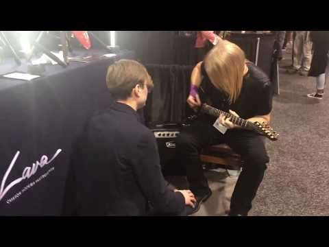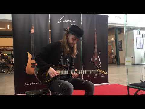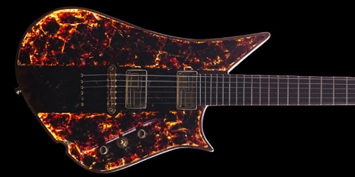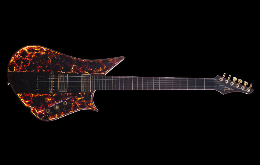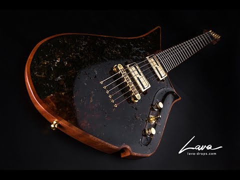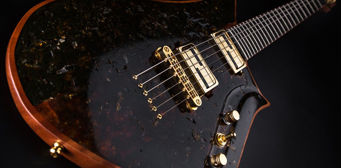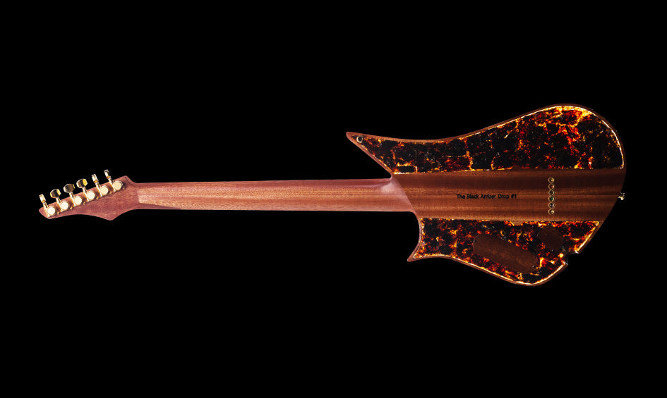 Rapolas Grazys wanted to create a guitar that connects the past and the future while also giving a nod to his home of Lithuania, where black amber from the Baltic Sea is harvested. The guitar is constructed using a single seamless piece of sapele wood for the body and neck with an ebony fretboard and 24-3/4" scale length. The neck utilizes two rods of carbon fiber for reinforcement. The sapele has been routed out in the body to house the 4.4 pounds of Baltic black amber, with a 5mm rim around the inlaid amber rocks. Baltic amber is over 45 million years old, produced by the pine trees which grew in Northern Europe and around the Baltic Sea. It is also considered by many to have therapeutic properties due to its high level of succinic acid, a compound said to have analgesic and anti-inflammatory properties. The fact that the Baltic amber is millions of years old is humbling to say the least when you pick this instrument up to play. The guitar as an instrument is a joy to play, with a very fast and striking response to notes and chords, due to the rigidity of the amber. The neck has a rounded profile, with large frets that give way to fast riffing. The pickups are Lace Alumitone humbuckers, and rounding out the looks of this one of a kind guitar are gold hardware, and a 24 karat gold Lava headstock logo.