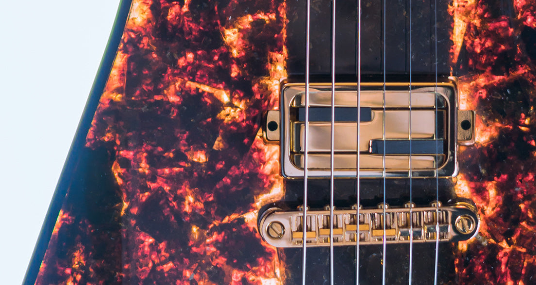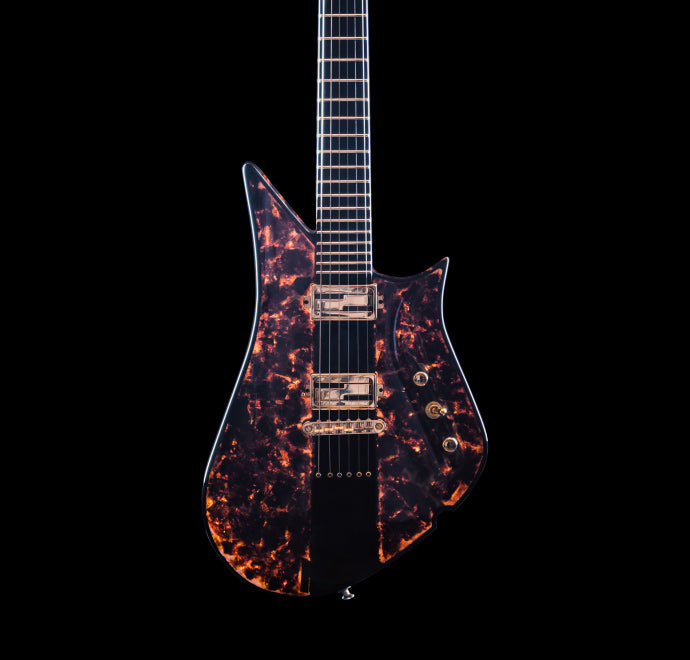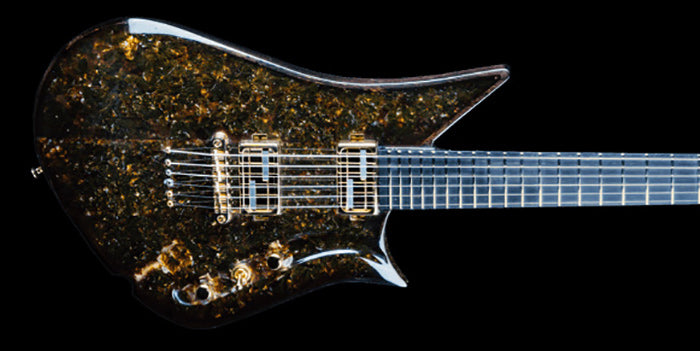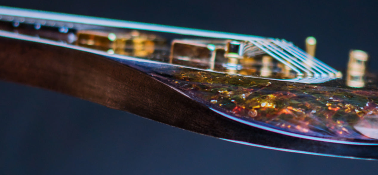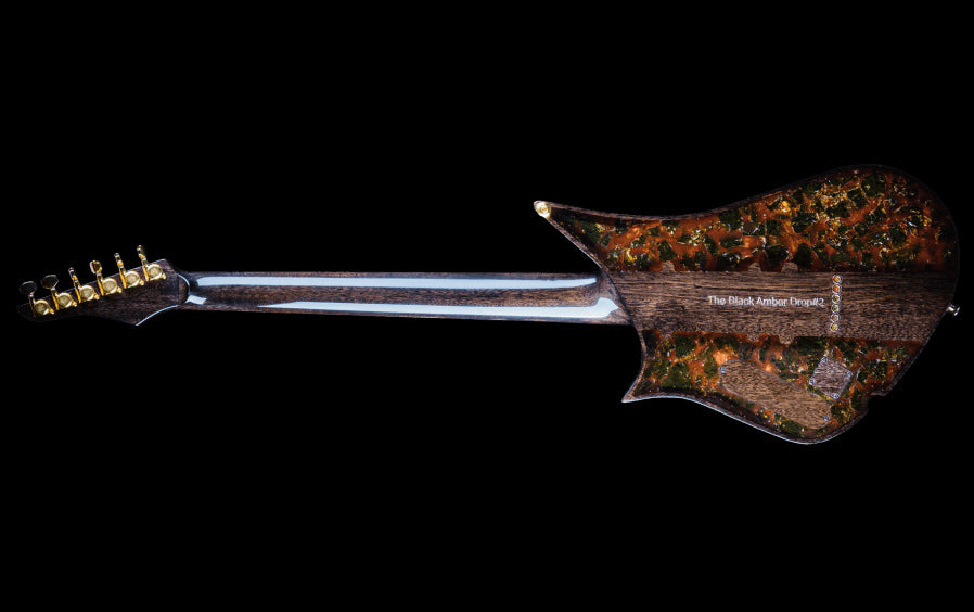 Rapolas Grazys wanted to create a guitar that connects the past and the future while also giving a nod to his home of Lithuania, where black amber from the Baltic Sea is harvested. The construction of the guitar is a single seamless piece of darkened sapele wood for the body and neck with an ebony fretboard and 25.5 scale length. The neck is reinforced by two rods of carbon fiber. The sapele has been routed out in the body to house the 4.4 pounds of Baltic black amber, with a 5mm rim around the inlaid amber rocks. Baltic amber is over 45-50 million years old, produced by the pine trees which grew in Northern Europe and around the Baltic Sea. It is also considered by many to have therapeutic properties due to its high level of succinic acid, a compound said to have analgesic and anti-inflammatory properties. The fact that the Baltic amber is millions of years old is humbling to say the least when you pick this instrument up to play. The guitar as an instrument is a joy to play, with a very fast and striking response to notes and chords, from the rigidity of the amber. The neck has a rounded profile, with large frets that give way to fast riffing. The pickups are Lace Alumitone humbuckers, and rounding out the looks of this one of a kind guitar are gold hardware and a 24 karat gold Lava Guitars headstock logo.