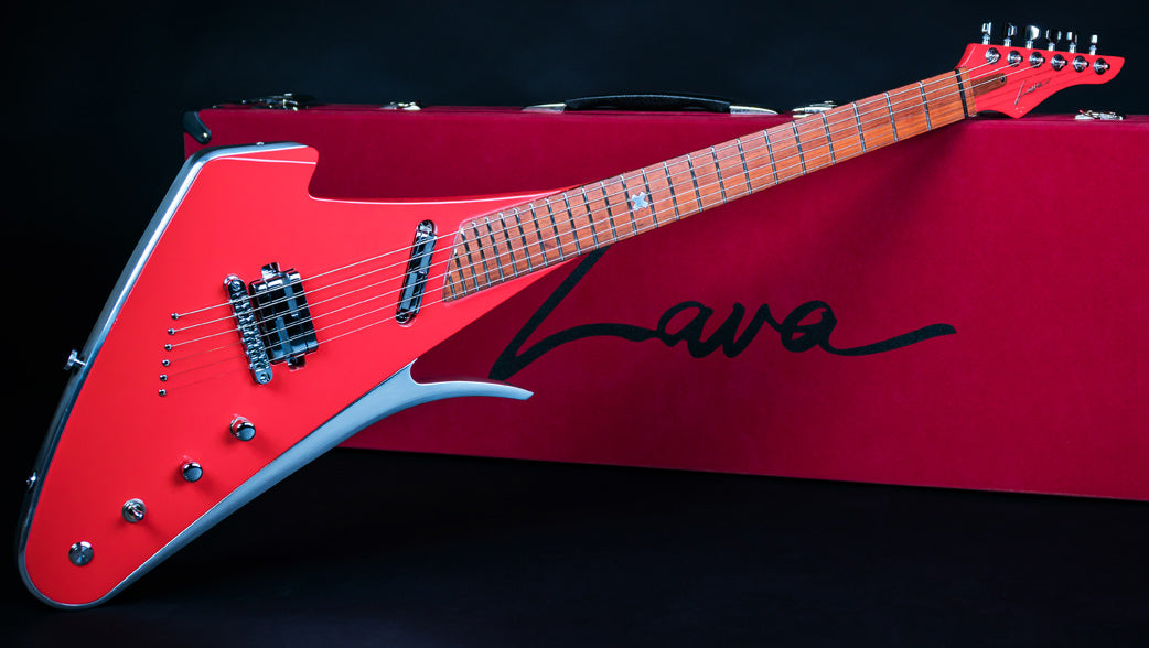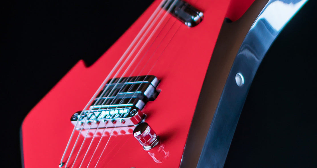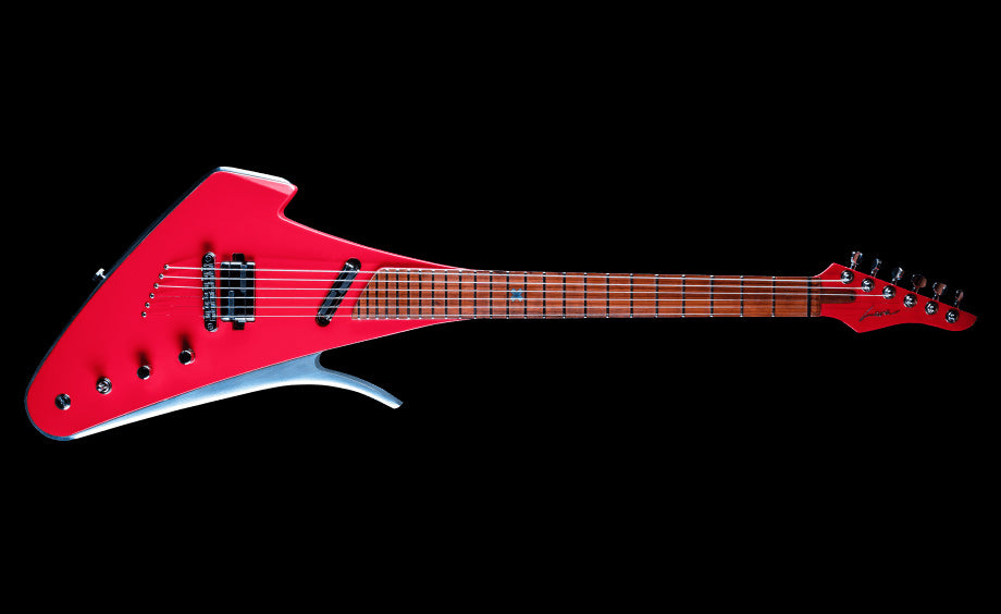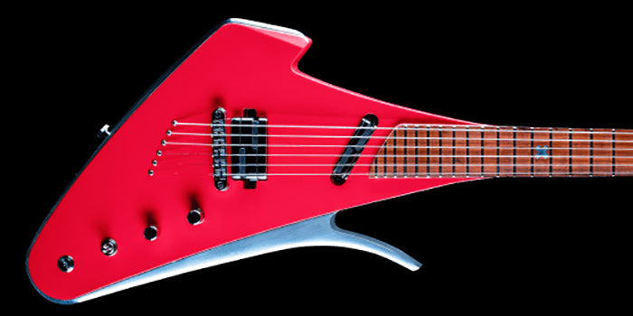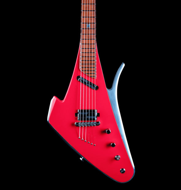 The futuristic musical art piece handcrafted in a combination of Mahogany wood and aircraft grade aluminium contour. These precious materials connects the past and the future and creates unimaginable resonance and fascinating sustain. Main guitar body is crafted from a neck-trough Mahogany construction which is coloured in special Rose color. Aircraft grade aluminum contour gives very high frequency and sustain. Instrument fingerboard is crafted from rare Padauk wood. Special aluminum X inlay is encrusted in the fingerboard.